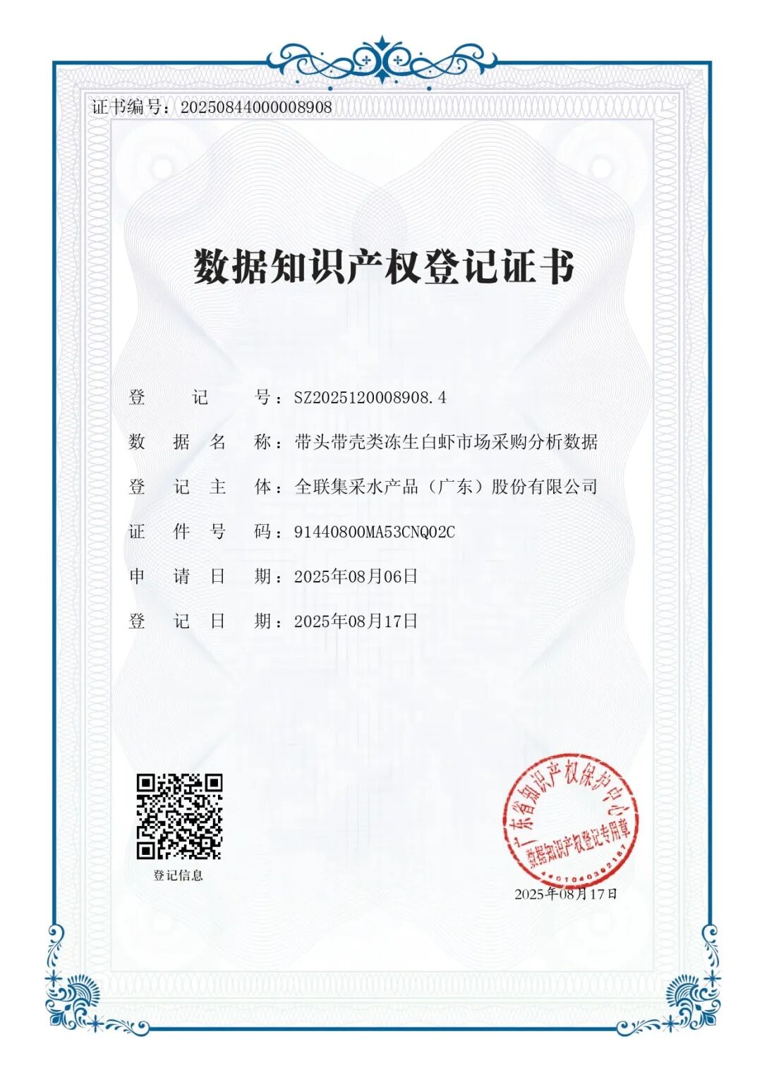 近日,全联集采成功获得广东省数据知识产权存证登记平台颁发的两项数据知识产权登记证书,分别是《带头带壳类冻生白虾市场采购分析数据》和《全联集采水产品冻生白虾(去头带壳)订单分析数据》。这一重要成果,标志着全联集采在数据要素确权与应用方面迈出了坚实一步,也是公司推进数智化建设的重要里程碑。